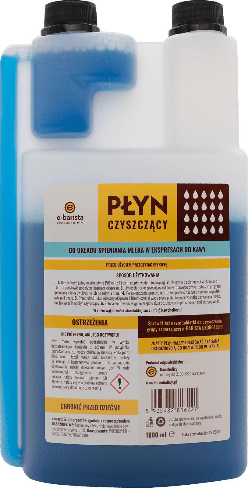 Płyn do układu mleka ebarista jest detergentem specjalnie zaprojektowanym do czyszczenia i odkażania dyszy pary (lub spieniacza do mleka) oraz obiegu mleka we wszystkich ekspresach do kawy.