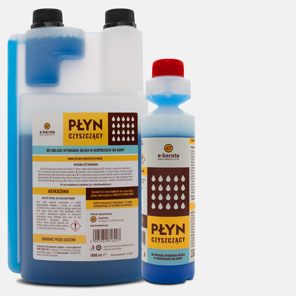 Płyn do układu mleka ebarista jest detergentem specjalnie zaprojektowanym do czyszczenia i odkażania dyszy pary (lub spieniacza do mleka) oraz obiegu mleka we wszystkich ekspresach do kawy. 1 litr i 250 ml.